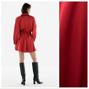 🌹NWT. Zara Dark Pink/Red Satin Shirt Mini Dress with V-neck. Size L.