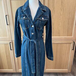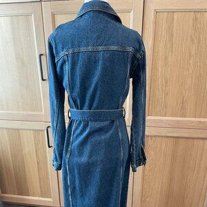 100% Cotton Denim Midi Dress with Self-Tie removable belt. Heavy weight denim with full button front and pockets