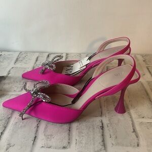 Dressy special event heel.Pop of Hot pink will add pizazz to any outfit, any season. New with tags no flaws. Rhinestone bow to amp up pointed toe!