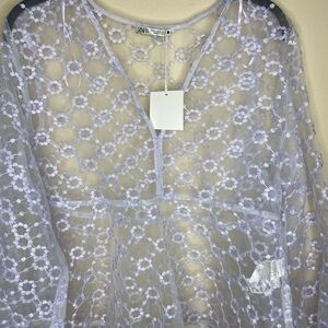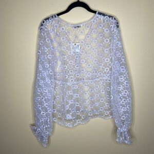 V-neck blouse with long balloon sleeves with elastic cuffs.