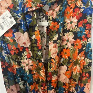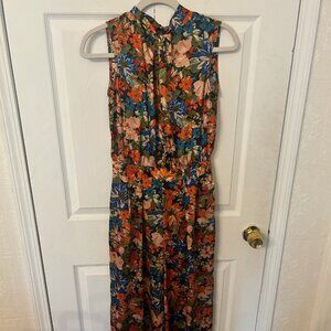 Multicolor floral sleeveless jumpsuit from Zara, size XS. New with tags/never worn. 100% polyester. In the front it zips to the waist and then hooks at the neck with two buttons but the chest is open, have tried to show this in photos.