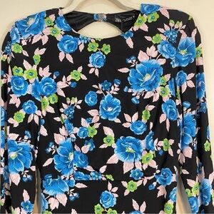 NWT Zara Floral Mini Long Sleeve Open Back Blue Black Dress