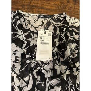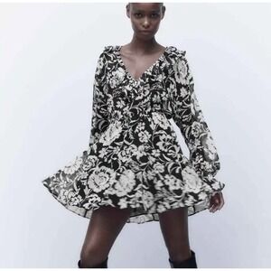 NWT Zara Floral Print Mini Dress with Ruffles in Black/White Monochrome Women S