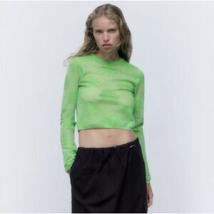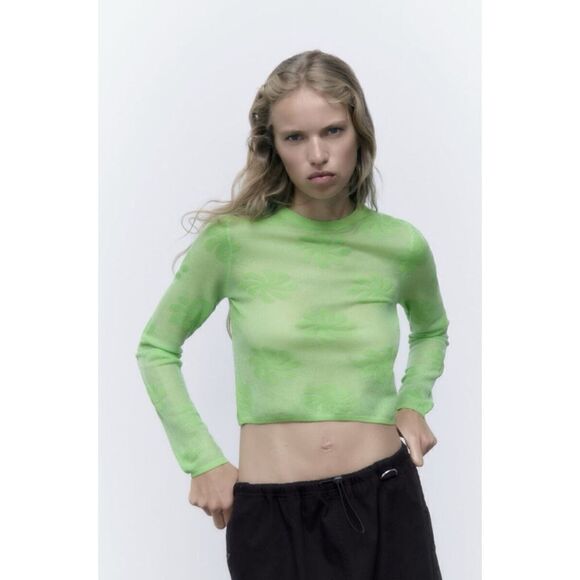 NWT Zara Floral Semi Sheer Mesh Metallic Effect Knit Long Sleeve Cropped Sweater