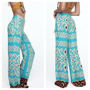 NWT Zara Flowy Printed Wide Leg Pants Womens Large Teal Boho Festival Hippie