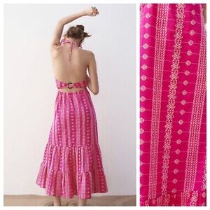 NWT. Zara Fuchsia Openwork Embroidered Midi Dress with V-neck and spaghetti straps, contrasting embroidered eyelet detail. open back with ring and elastic appliqués, flounced hem. Size L. Ref. 3583/931. Pit to pit 17" flat, waist 17,5", length 50". 1027