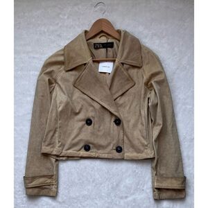 NWT Zara Garment Dye Faux Suede Short Double Breasted Cropped Trench Style Coat