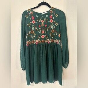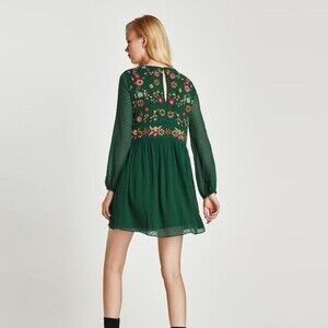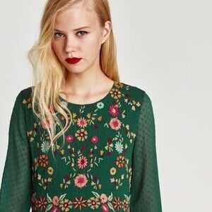 NWT ** Zara Green Floral Embroidered Dotted Mesh Dress Size M