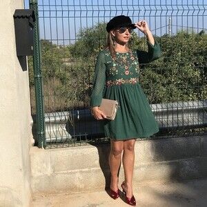 Round neck dress with long puff sleeves. Fastens with a buttoned opening in the back. Features embroideries on the front and back. interior lining.