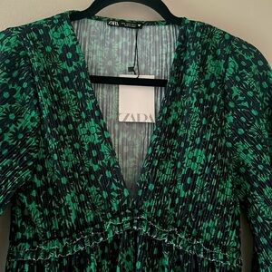 NWT Zara Green & Navy Floral Printed Mini Dress Size Medium