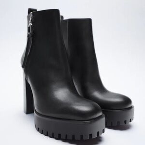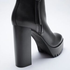 NWT. Zara High Heel Treaded Ankle Boots. Black heeled ankle boots. Wide high heel. Back pull tab. Lug sole. Side zipper closure with pull tab detail. Heel height: 4.3 inches (11 cm). Size 9. Ref 3101/710. SH 18