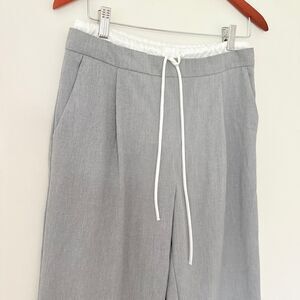 Zara wide leg pants in gray with double adjustable waistband and drawstring. Elastic high waist, front pockets, faux back welt pocket. Side hidden zipper. 100% polyester. Small flaw on zipper (see photo). Relaxed, modern silhouette great for minimal or elevated looks.