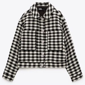 Brand new with tags Zara houndstooth tweed blazer — a timeless, chic layer perfect for fall and winter wardrobes. Crafted from a wool blend for warmth and texture, this tailored piece features sparkling jewel buttons, a cropped fit, and a black-and-white gingham houndstooth pattern. Ideal for both business casual and polished weekend looks.