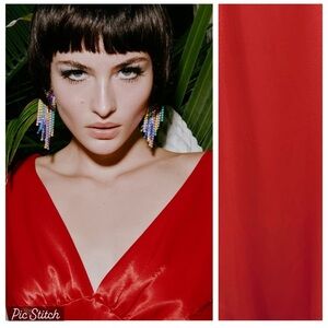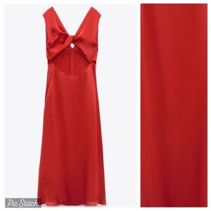 NWT. Zara Intense Red Satin Effect Lingerie Style Midi Dress with gathered V-neckline, sleeveless, opening detail and knot at back, front slit at hem, side hidden in-seam zipper closure. Size M. Ref. 3666/087. Pit to pit 17,5" flat, waist 15", length 52". 1040. 1052