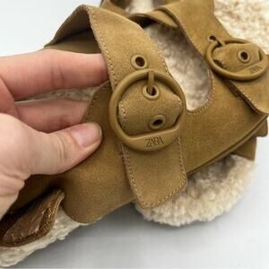 NWT Zara Leather Shearling Buckle Sling Back Flat Sandal Slipper Brown Cream 39