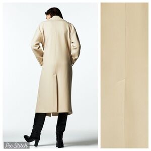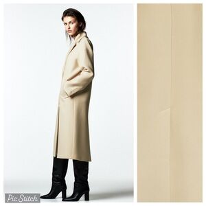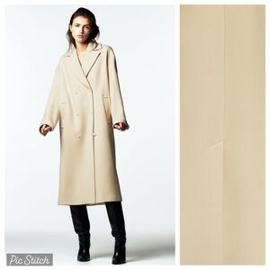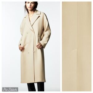 NWT. Zara Limited Edition Pastel Yellow Wool Blend Double Breasted Oversized Coat with lapel collar, long sleeves, side pockets, back vent at hem, tonal matching inner lining, front double breasted button closure. Size M. Ref. 8864/744. OUTER SHELL: 75% wool · 25% polyamide. LINING: 100% viscose.