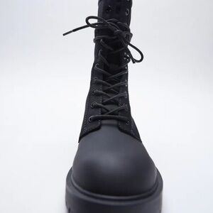 NWT. Zara Low Heel Rubberized Ankle Boots. Low heel ankle boots in black. Upper in a combination of materials. Back pull tab. Lace closure. Size 8. Ref 1101/710. SH 7