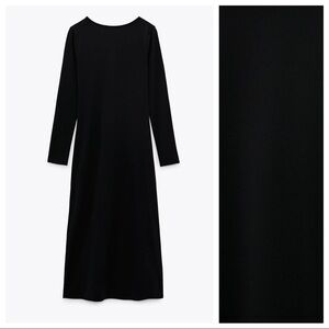 NWT. Zara Black Midi Dress with Ruffled Detail, round neckline, long sleeves, ruffled detail with contrasting piping on front, asymmetric hem. Size M. Ref. 1198/032. Pit to pit 16" flat, shoulders 13,5", sleeves 23", length 51-55". 1047.
