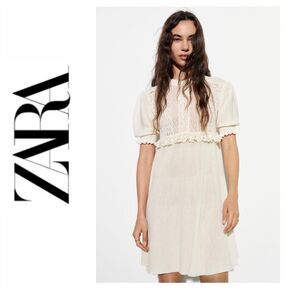 NWT Zara Mixed Pointelle Contrast Lace Detail Knit Mini Dress in Ecru, Medium