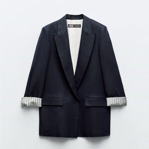 NWT. Zara Navy Blue Linen Blend Open Front Blazer. Lapel collar and long sleeves with padded shoulders. Front flap pockets. Size XXL. Ref. 7726/392. Pit to pit 24" flat, shoulders 17", sleeves 25", length 30". Bs
