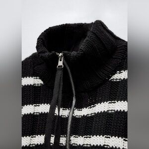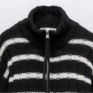 NWT. Zara Navy Blue Striped Knit Cropped High Neck Cardigan with long sleeves. Zip-up front. Size S. Ref. 6771/023. Pit to pit 26" flat, shoulders 22", sleeves 22", length 13". SW