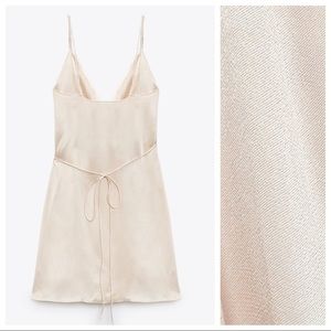 Bundle any 2 items marked 🌹 for $45! NWT. Zara Nude Beige Satin Effect Wrap Mini Dress with thin straps, back tie closure. Size S. Ref. 3067/304. Pit to pit 15" flat, length 33". 1022
