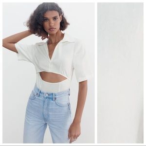 NWT. Zara Off White Stretch Linen Blend Cut-Out Bodysuit with collar, short sleeves, bottom snap button closure. Size S. Ref. 7385/002. Pit to pit 16" flat, shoulders 15", sleeves 10,5", length 27". 1005. DO3.