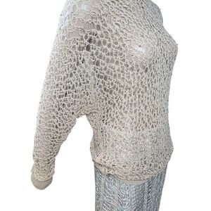 Brand new with tags open-knit sweater featuring a shimmering beige-gold hue and delicate silver-tone bead accents. Designed with a relaxed silhouette, dropped shoulders, ribbed cuffs, and a wide neckline for an effortlessly chic drape. Semi-sheer texture creates a light, airy look that layers beautifully over camisoles, bralettes, or swimwear.
