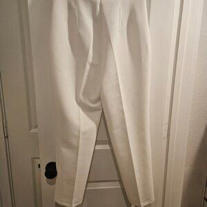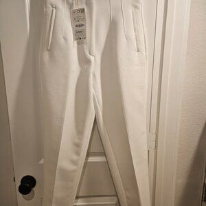 Pants with a high waist and pronounced seams at front and back for a flattering cinched waist. Front welt pockets. Front zip, metal hook, and interior button closure.
