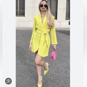 Zara Limited Edition Pareo dress in lime green. New with tags. Blazer silhouette. Deep V-neck. Wrap front. Side tie closure. Structured shoulders. Long sleeves. Mini length. Lined. Variations in color are due to lighting conditions. The dress is not yellow. Gorgeous dress. I've also seen it worn over jeans like a blazer. Super cute.