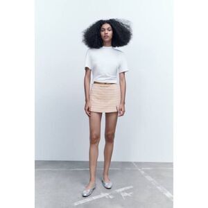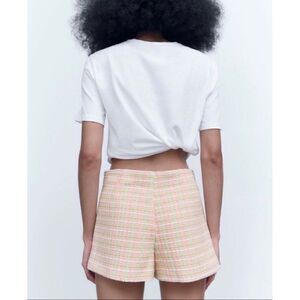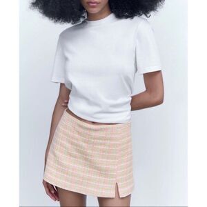 Zara textured tweed-like plaid skort in light, pink, lime, green, white.