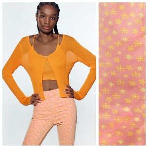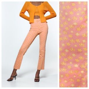 NWT. Zara Pink/Yellow Floral Print Flared Cropped Jeans with high waist, five pockets flared legs, stretch fabric, raw hem. Size 4. Ref. 5520/016. Waist 12,5" flat, rise 11", inseam 26". 1057