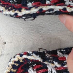 Elegant tweed jacket with intricate detailing. Features buttoned front pockets. Perfect for a chic look.