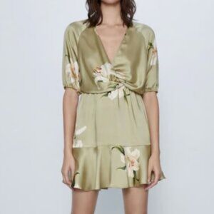 Dress with V-neck and short sleeves. Elastic waistband. Front knot detail.