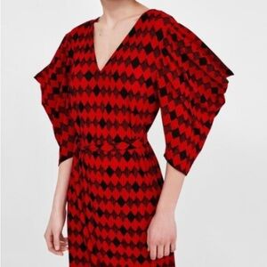 NWT Zara Red Black Belted Tie Geometric Argyle Pattern Chic Maxi Dress Small S