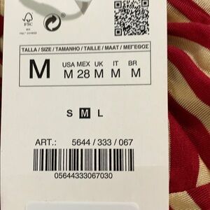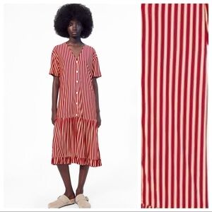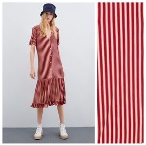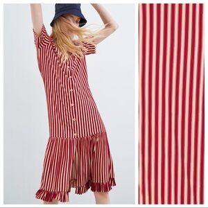 NWT. Zara Red/Yellow Striped Midi Dress with V-neckline, short sleeves, front buttons closure, ruffled hem. Size M. Pit to pit 20" flat, shoulders 16", sleeves 10", length 46". 1018