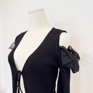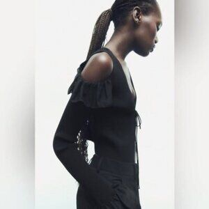 NWT Zara Ribbed Knit Tie Front Ruffle Open Cardigan Blouse Top Black New Small