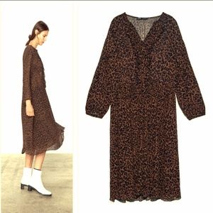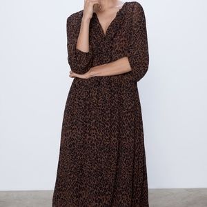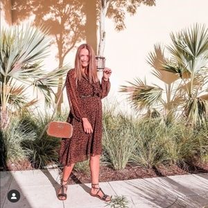 Brown midi dress with ruffled V-neck and long sleeves. Interior lining. Front button closure.