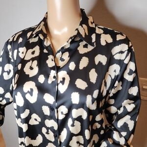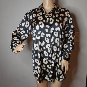 Zara long sleeve button down shirt featuring a striking ivory and black animal print in a silky satin finish. Leopard Cheetah