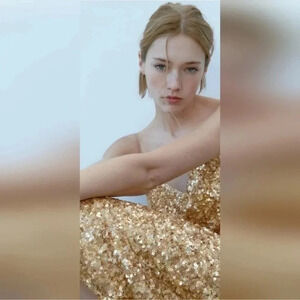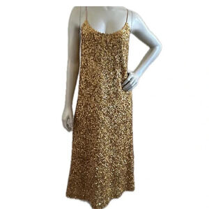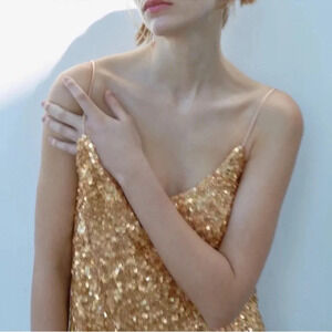 Zara Sequin Slip Dress Limited Edition. Midi slip dress. Round neck. Spaghetti straps. Color gold. Outer shell 100% polyester. Lining 100% polyester.