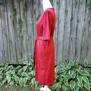Simple yet sophisticated this soft stretchy shirt dress reminds me of a 70s style. The material is sort of like a faux suede. It comes with a matching faux leather belt. Dress is 89% Polyester and 11% Elastane. Belt is 100% Polyurethane. I think it is burgandy.