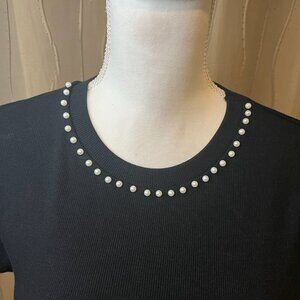 Zara Trafaluc Black Ribbed Cotton Short Sleeve Top with faux pearl accent collar, Size Large