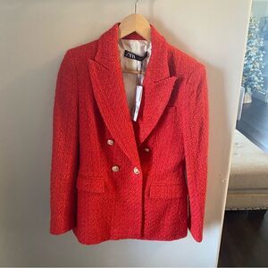 New with tags blogger fav red Zara textured tweed double breasted blazer with gold buttons. Size small. Pit to pit buttoned up is 18 inches.