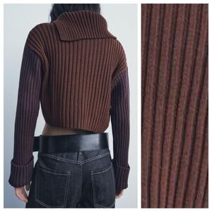 NWT. Zara Two-Toned Brown Rib Knit Cropped Sweater with lapel collar and long turned up sleeves. Size M. Ref. 6771/138. Pit to pit 19" flat, shoulders 20", sleeves 23", length 18". SW.