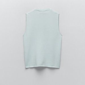 Knit vest / jacket with button down and pockets. V-neck. Structured. Color is a light mint green / blue (like a baby Tiffany's blue).