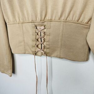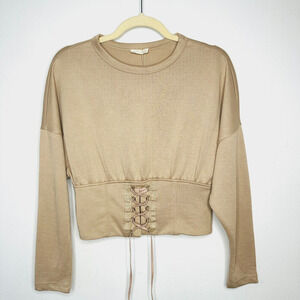 Zara W & B Collection Tan Long Sleeve Front Corset Tie Up Top Round Neck