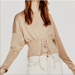NWT Zara W & B Collection Tan Long Drop Sleeve Front Corset Lace Up Waist Top M