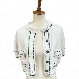 NWT Zara White Cropped Cardigan with Embroidered Navy Blue Trim Size L