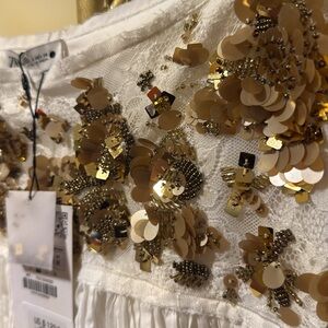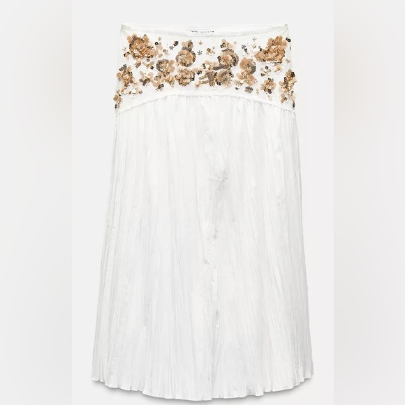 NWT Zara | White Gold Midi A-Line Skirt beaded bead lace