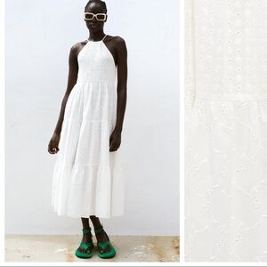 NWT. Zara White Halter Cutwork Embroidery Midi Dress. Size M.